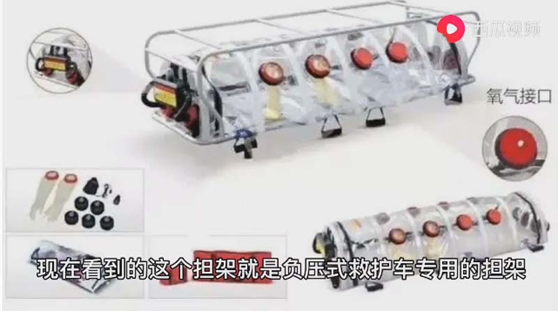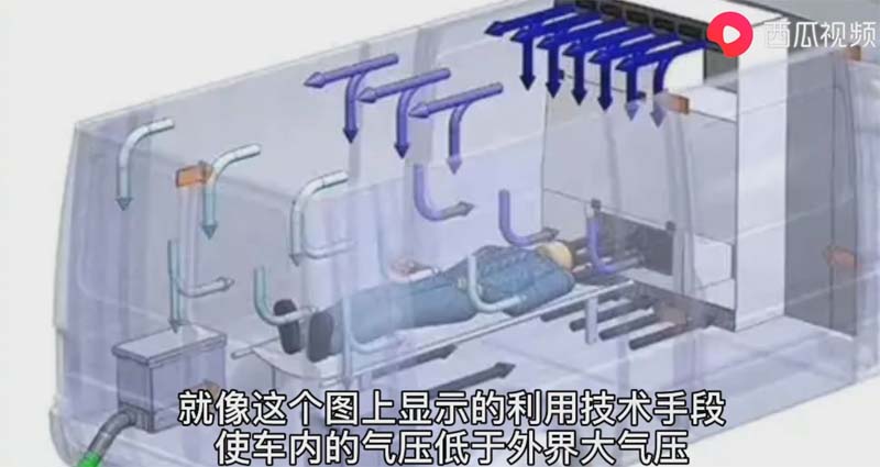 在车辆行驶状态下通过空气的自由流动,只能把车外的气流流向车内,而且车内的气体通过无毒化处理后排出车外。像这种属于人传人的传染病可以避免更多的人被传染。在运转病人的时候也可以最大限度的隔离病人和医护人员。同时可以使医患互相感染。现在看到这个担架就是负压救护车的专用担架。