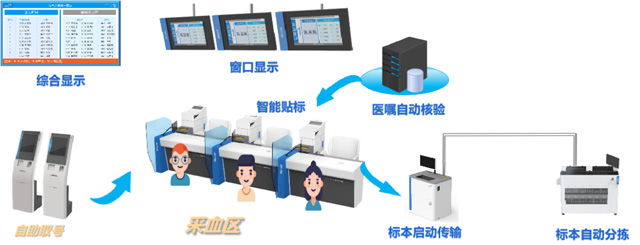 采血流程:患者到窗口采血-扫码或读就诊卡-核对检验项目-打印标签-选择试管-粘贴试管-护士采血。人工采血存在问题人工选管、打印、粘贴,劳动强度大。容易出现人为错误。贴歪、贴倒(不能识别)。位置错误(流水线无法识别)。视窗覆盖(无法观察血液情况)。可能出现漏采或多采血。智能采血设备解决采血人的排队难题,智能采血管理系统把采血管的准备工作自动化,缩短等待时间。采血流程需要全面的优化,报到取号,65岁以上老人优先。智能叫号不需要长时间的排队。采血管容量大,处理速度快,能有效加快采血速度,提高采血服务质量。自动化代替了传统人工的操作模式。自动识别自动贴标,自动标本核收。大大的减少人工误差。也减少繁杂的采血前准备,系统具有诸多优势,将为客户带来全新的体检体验。