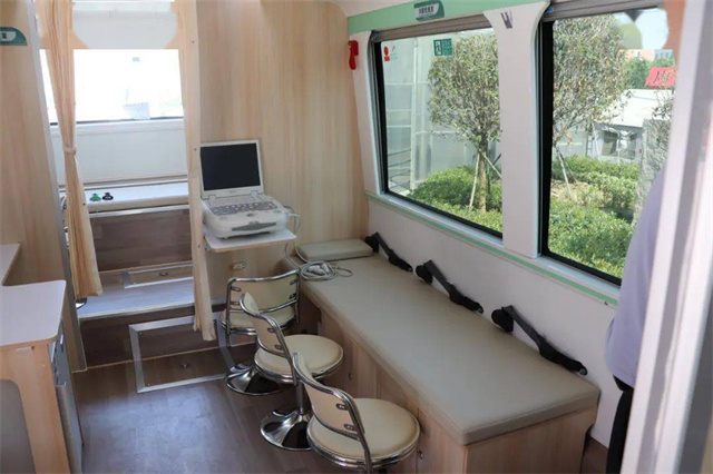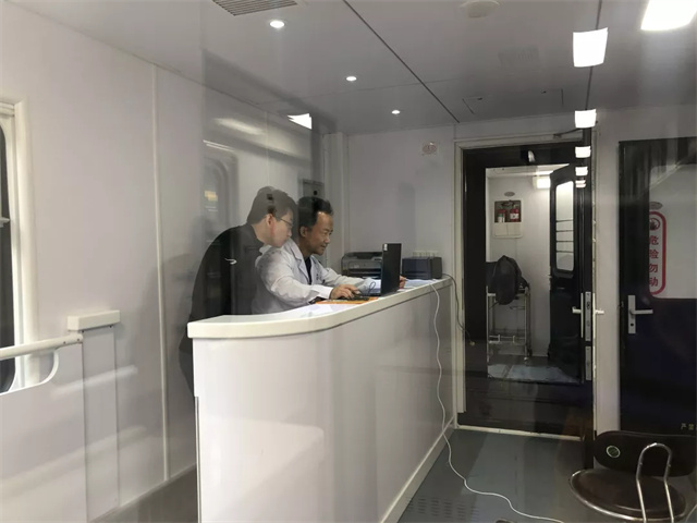 体检车上都有这些检查室?车厢里有男女彩超室,男女心电图室,内科、外科以及,骨密度、碳十三检测室等,可以对血常规、肝胆功能,肾功能、空腹血糖、尿常规,心电图、肝胆胰脾B超等项目进行检查。车上都有这些功能室?候诊登记处可以在候诊区等待就诊,各类医疗用品和采样冷藏柜也很完善。体检车厢配置了全自动生化分析仪、全自动尿液分析仪、B超检查室、心电图检查室等,可以进行前台导诊、采血、尿液检查、实验室化验、DR拍摄、超声心电检查等项目,能够为职工进行全面体检,最快当天即可出结果。